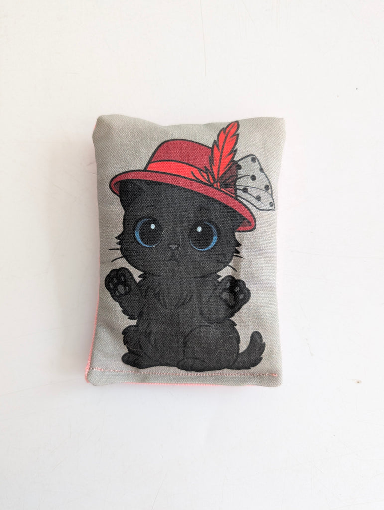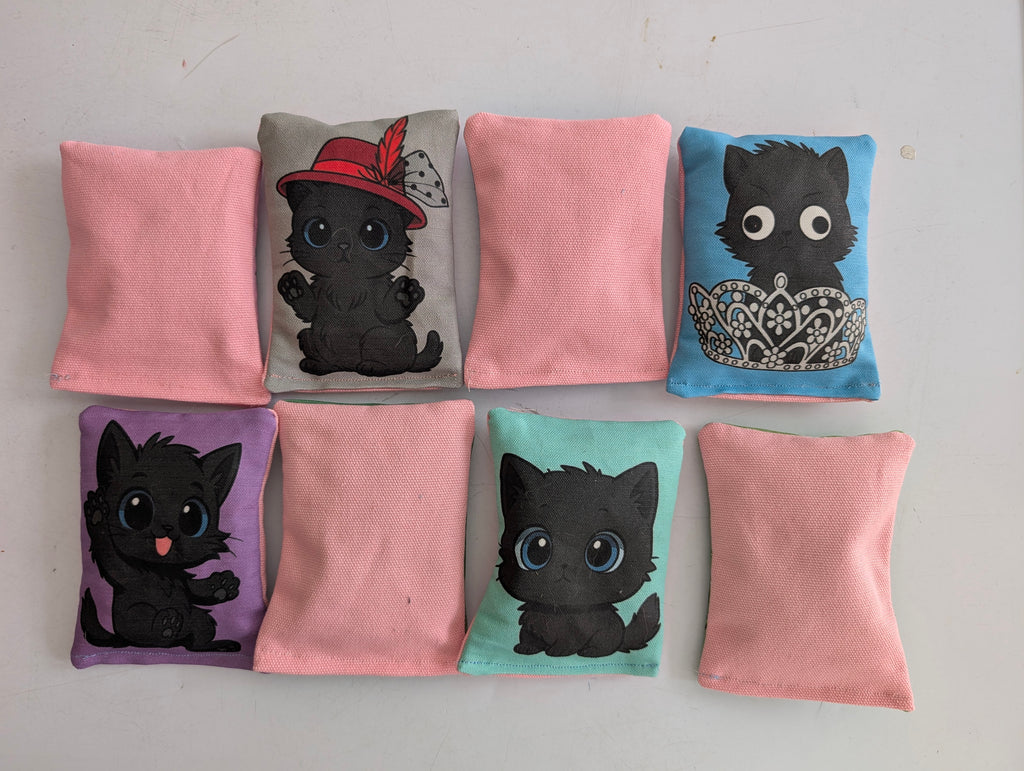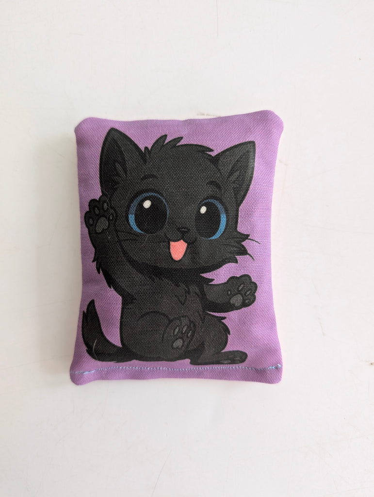 Pillows are made with 100% cotton & filled with a catnip & silvervine mixture. The pattern you will receive will be THREE of the options shown and will be randomly chosen for your order. The back of the pillow is a solid color or a surprise pattern. Pillow measure 5" long and 3" wide.