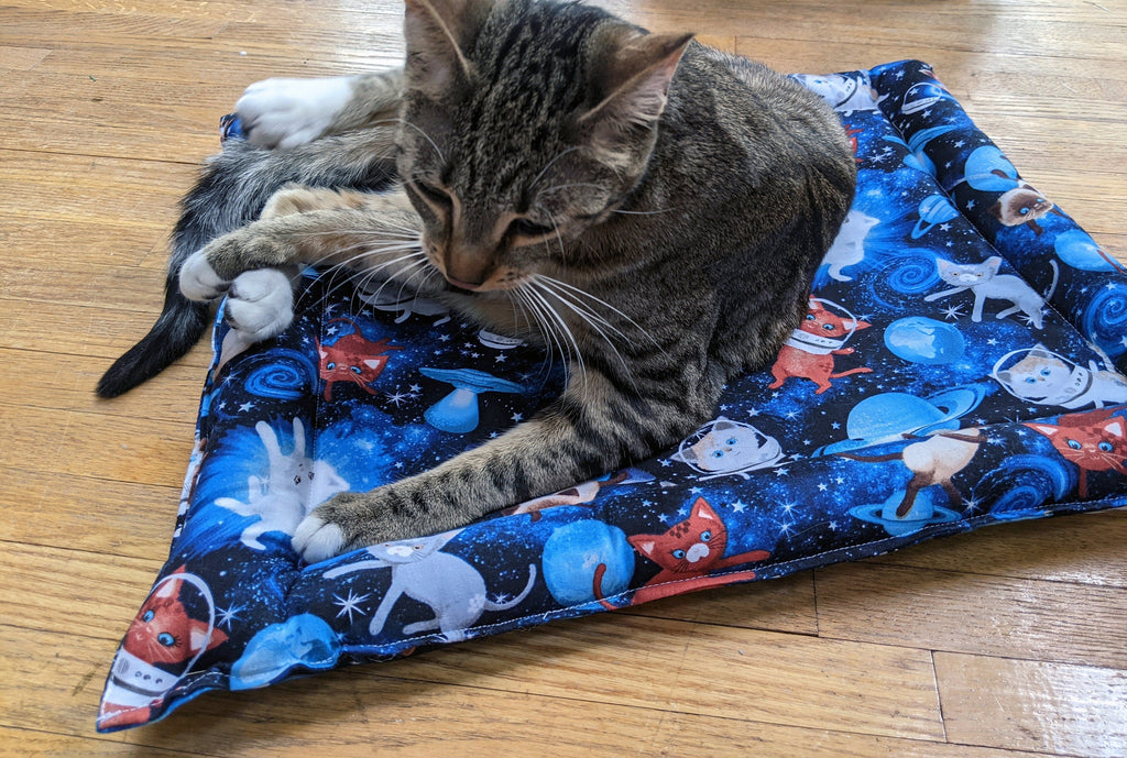 This is a handmade 100% cotton bed filled with catnip & silvervine. The edges are stuffed with polyfil and the middle of the bed has two layers of quilt batting with catnip & silvervine sewn in between the layers.