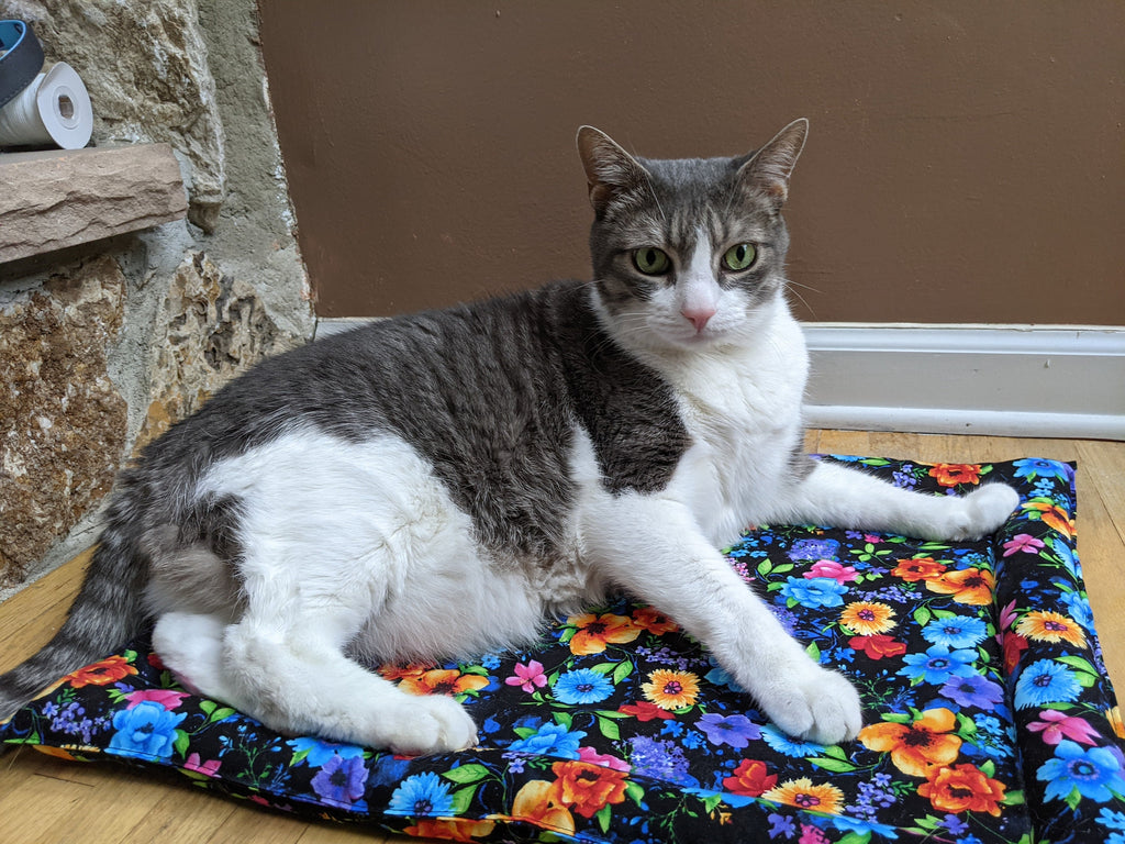 This is a handmade 100% cotton bed filled with catnip & silvervine. The edges are stuffed with polyfil and the middle of the bed has two layers of quilt batting with catnip & silvervine sewn in between the layers.
