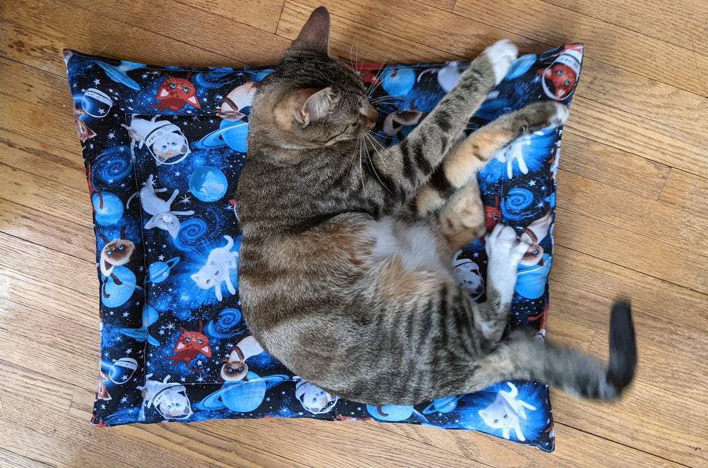 This is a handmade 100% cotton bed filled with catnip & silvervine. The edges are stuffed with polyfil and the middle of the bed has two layers of quilt batting with catnip & silvervine sewn in between the layers.